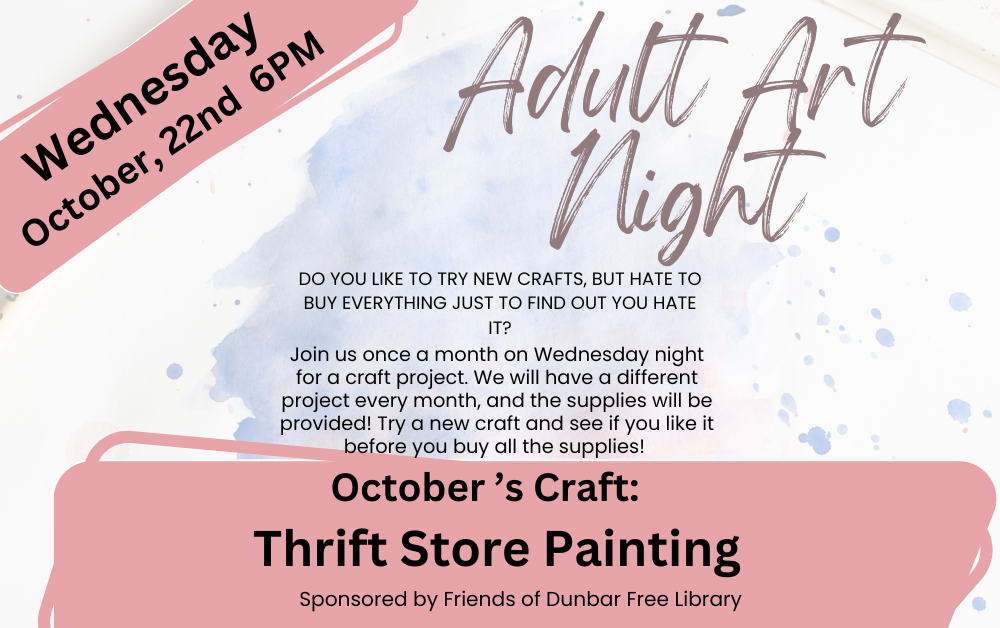 Category: Adults Adult Art- Thrift Store Painting Adult Art- Thrift Store Painting 6:00 pm – 7:00 pmOctober 22, 2025 Dunbar Free LibraryRt 401 NH 10 SouthGrantham, New Hampshire 03753United States6038632172Map Dunbar Free Library Sign up Here iCal Google View full calendar
