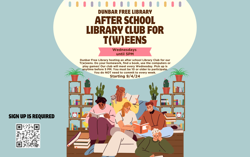 Dunbar Free Library hosting an after school Library Club for our T(w)eens. Do your homework, find a book, use the computers or play games! Our club will meet every Wednesday. Pick up is anytime before 5 PM. You must be 10 or older to participate. You do NOT need to commit to every week.