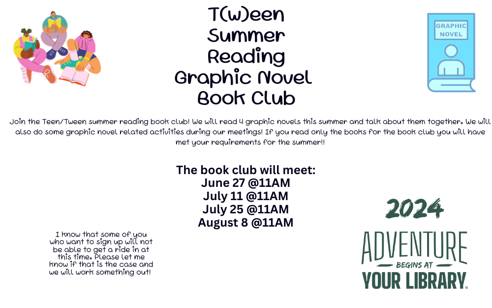 Join the Teen/Tween summer reading book club! We will read graphic novels this summer and talk about them together. We will also do some graphic novel related activities during our meetings!