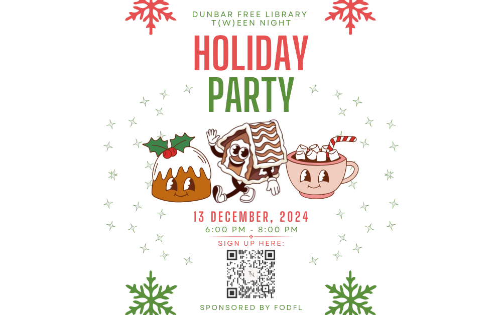 Category: Tweens Teen Night- Holiday Party Teen Night- Holiday Party 6:00 pm – 8:00 pmDecember 13, 2024 Dunbar Free LibraryRt 401 NH 10 SouthGrantham, New Hampshire 03753United States6038632172Map Dunbar Free Library Registration required Sign up Here iCal Google View full calendar