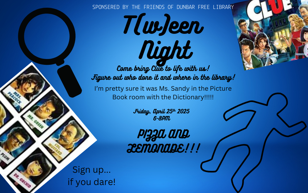 T(w)een Night- Real Life Clue 6:00 pm – 8:00 pmApril 25, 2025 Dunbar Free LibraryRt 401 NH 10 SouthGrantham, New Hampshire 03753United States6038632172Map Dunbar Free Library Sign up Here iCal Google View full calendar