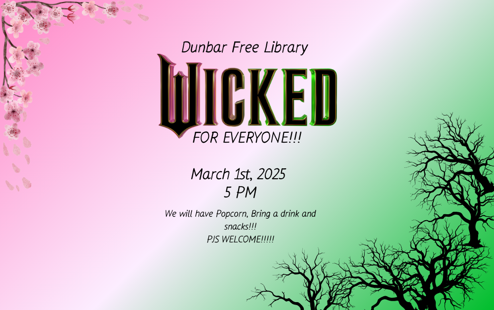 Wicked FOR EVERYONE 5:00 pm March 1, 2025 Dunbar Free LibraryRt 401 NH 10 SouthGrantham, New Hampshire 03753United States6038632172Map Dunbar Free Library iCal Google View full calendar